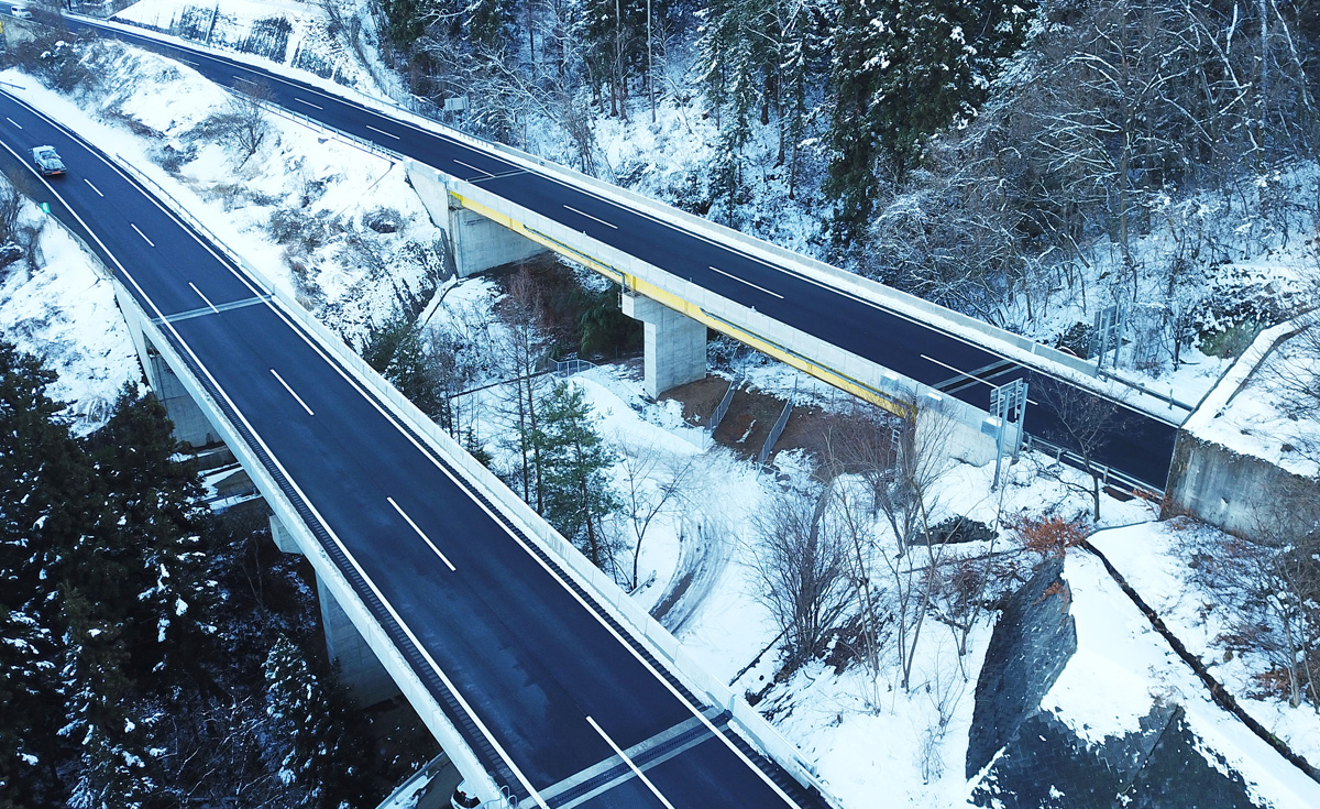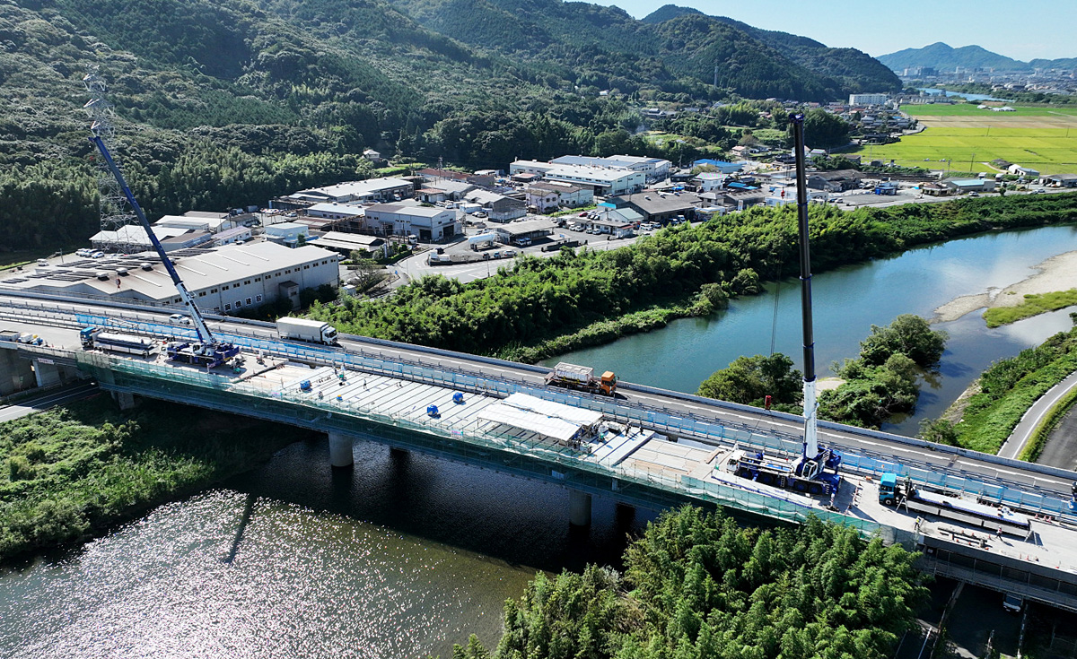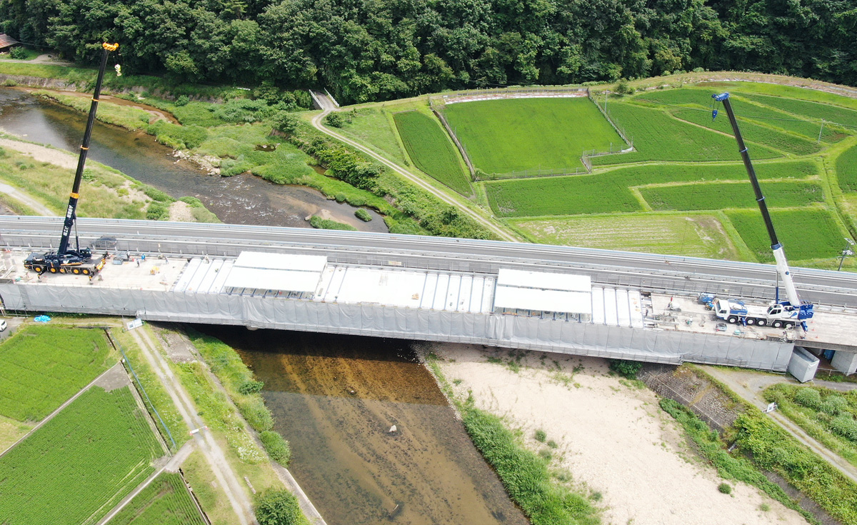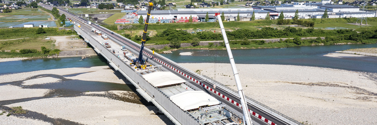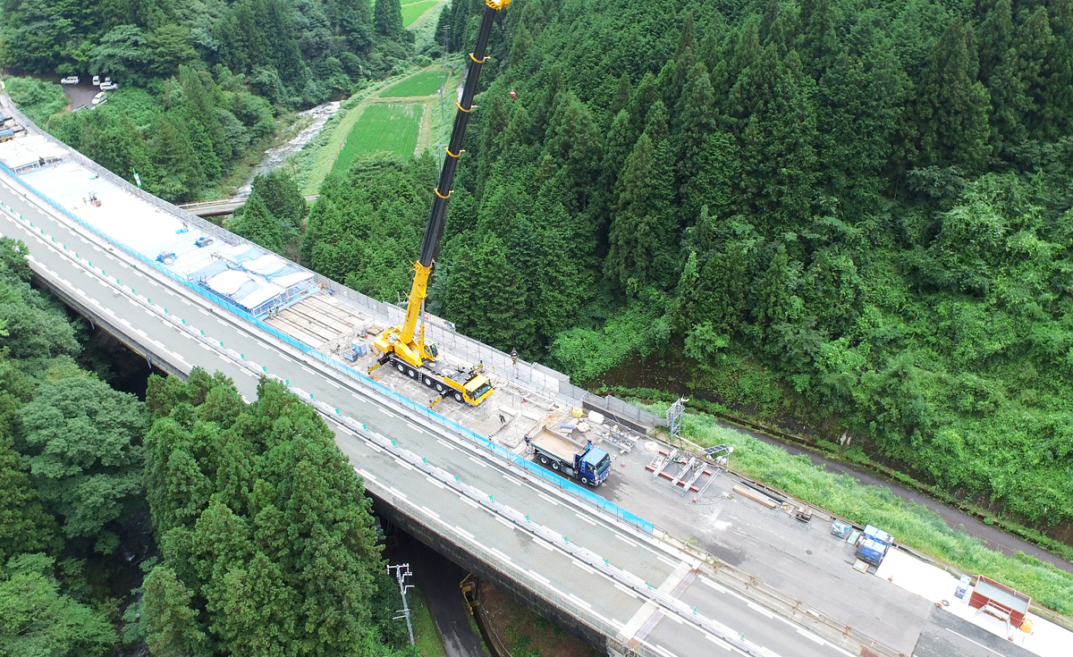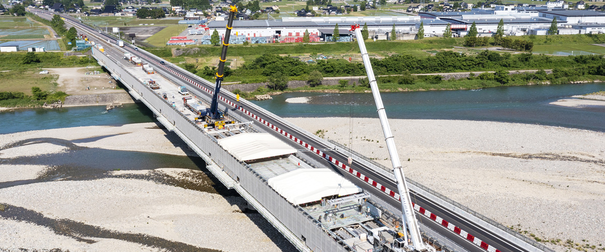 川田建設は、NEXCO各社が2014年度からの15年間で約3兆円規模の大規模更新・修繕事業を実施した当初から、橋梁の大規模更新における床版取替工事に取り組んでいます。本工事ではプレキャストPC床版が採用されており、PC専業者として活躍が期待されています。 この床版取替工事をより安全に、より高品質に、より高い生産性の実現に努めながら、当社における事業の柱となるよう、総力をあげて取り組んでいます。