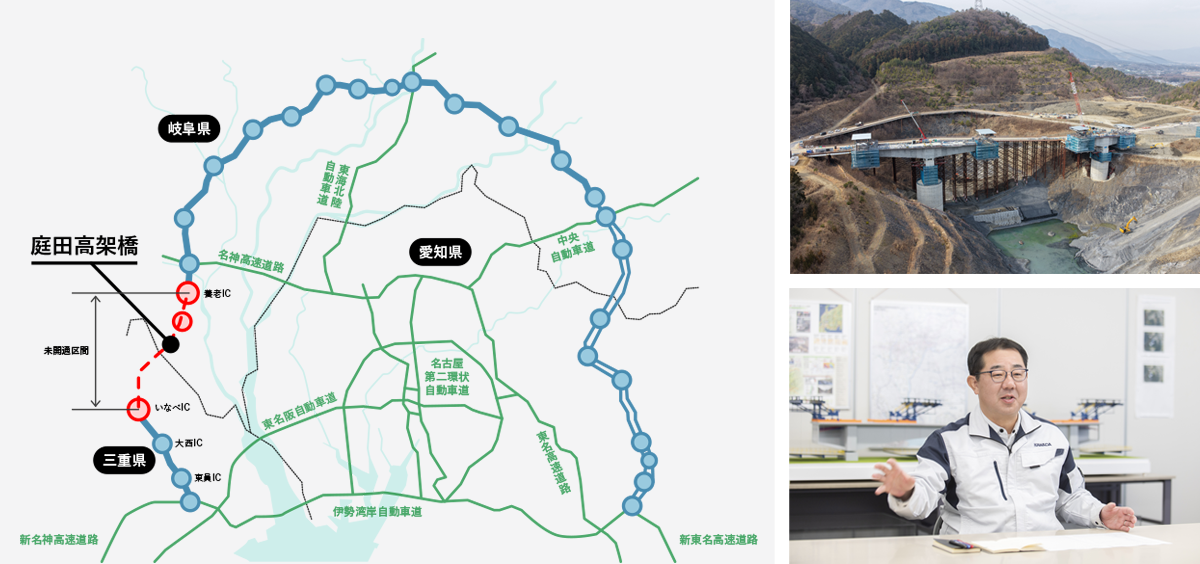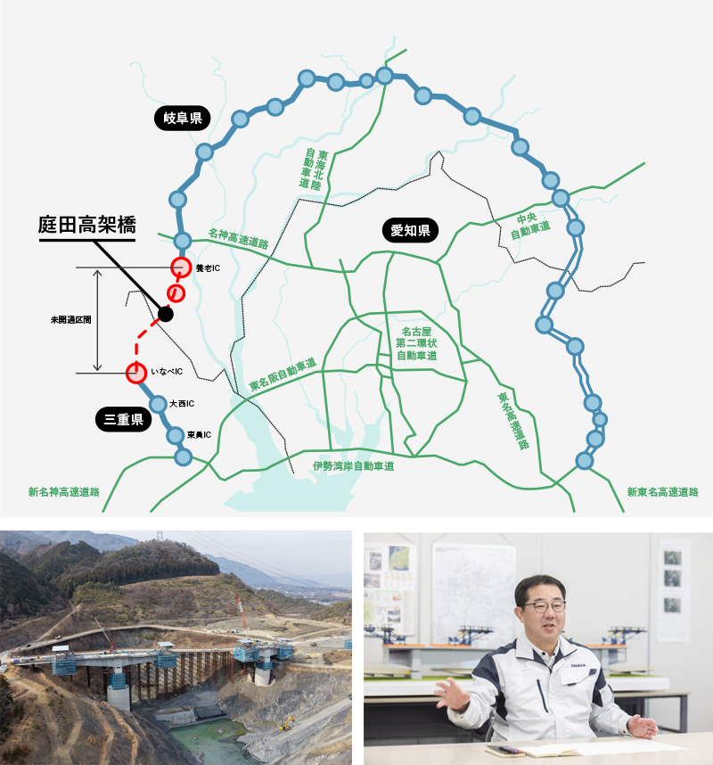 愛知・岐阜・三重の3県にまたがる 延長約153kmの東海環状自動車道。名古屋市を中心に広域的な交通ネットワークを形成する東海環状は2005年の愛知万博の開催に合わせ、先行して東回りルートが開通した。西回りルートも約9割は利用可能となっているが、「養老IC〜いなべIC」間の18.7kmのみ未開通区間になっている。この未開通区間の中心に位置するのが、国土交通省中部地方整備局が施主となる「東海環状 庭田高架橋PC上部工事」だ。国の管轄プロジェクトとしては近年では類を見ない規模の工事に、川田建設はこれまでの実績と新たな技術、そして情熱を原動力に臨んでいる。