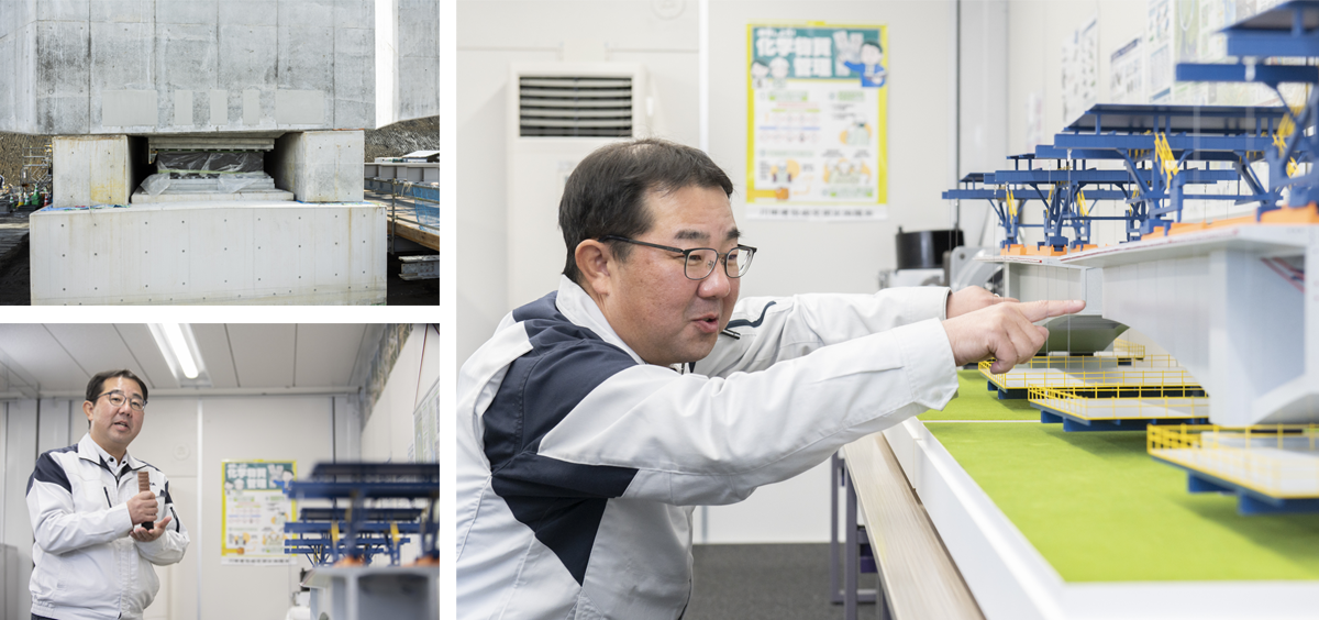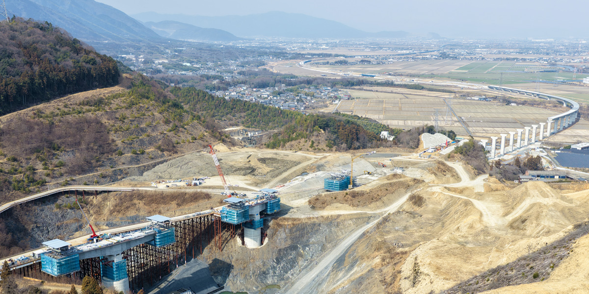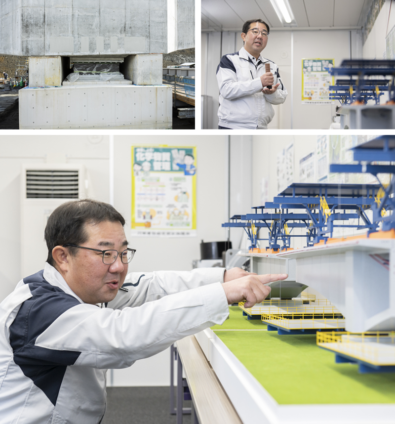 「東海環状 庭田高架橋PC上部工事」は案件化され、担当者たちははやる気持ちを押さえ早速現場に乗り込んだ。その一人が、本工事の所長を務める新川敦士。「上部工事にいつ着手できるかを見極める必要があった」と当時を振り返る。自分たちの目で地形や先行する下部工事の状況を確認し、張出架設工法と支保工架設工法を併用した施工に取り掛かったのは2025年4月のことだった。山間や渓谷、または交通量の多い道路上など、地上から支え(支保工)を組むことが困難な立地に採用される張出架設工法。急峻な地形を有する庭田高架橋においても、橋脚からコンクリートを打設して橋体を張り出す工事が進められている。支えがなく、空中に伸びていく橋体を、もう一方から伸ばされた橋体と連結させることで、橋は架かる。架橋のために現場の条件に応じて専用機材をカスタマイズし、“なければ創る”の精神で新たな機材を製作しながら、臨機応変に施工を進められるのは川田建設の大きな強みになっている。そして、各工程に凝縮するのは先を見据えた技術と工夫だ。橋梁の長寿命化を追求し、橋梁の外ケーブルには交換やメンテナンスのしやすい部材を採用。南海トラフ地震などの発生の可能性を踏まえ、揺れを吸収する「ゴム支承」はグレードを向上させ橋脚に設置した。さらに支保工ではICTを用いた施工現場端末アプリを導入し、作業の効率化と施工精度の向上を目指す。安全性と効率性の両輪によって川田建設は日本のインフラを支え続けていく。