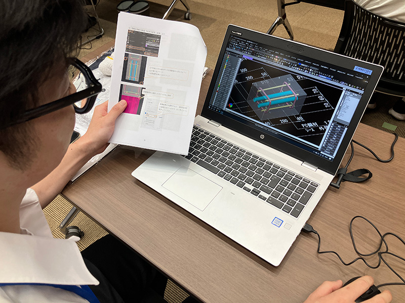 先ずは会社の自己紹介からスタートします。当社の経営ビジョンや事業内容、今後の取り組みについてご説明します。その後は、早速、仕事を体験していただきます。初日は3DCAD演習とドローン操縦。プロフェッショナルが使用する最先端のツールに触れることで、実践的なスキルを習得して「ものづくりの面白さ」を実感できます。