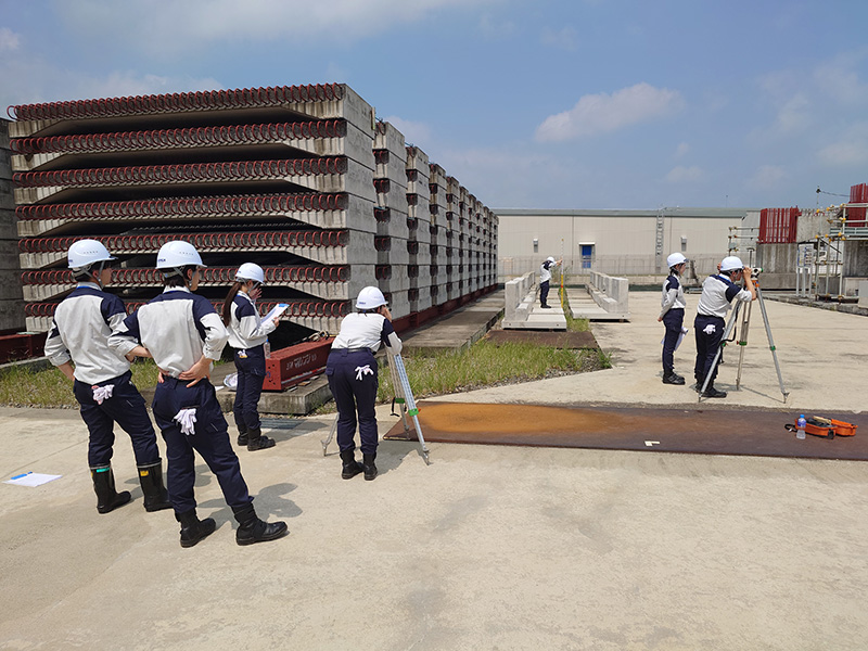 施工中の橋梁建設現場を訪問して、大規模な建設プロジェクトを間近で見学します。現場で活躍する方々の熱意と緊張感、重機などのダイナミックな動きや音の臨場感を体感。その後、研修施設で実際の建設現場を再現した環境で、出来形検測や測量といった施工管理業務を体験します。プロジェクトを確実かつ円滑に進めるための実践的な知識と技術を経験します。