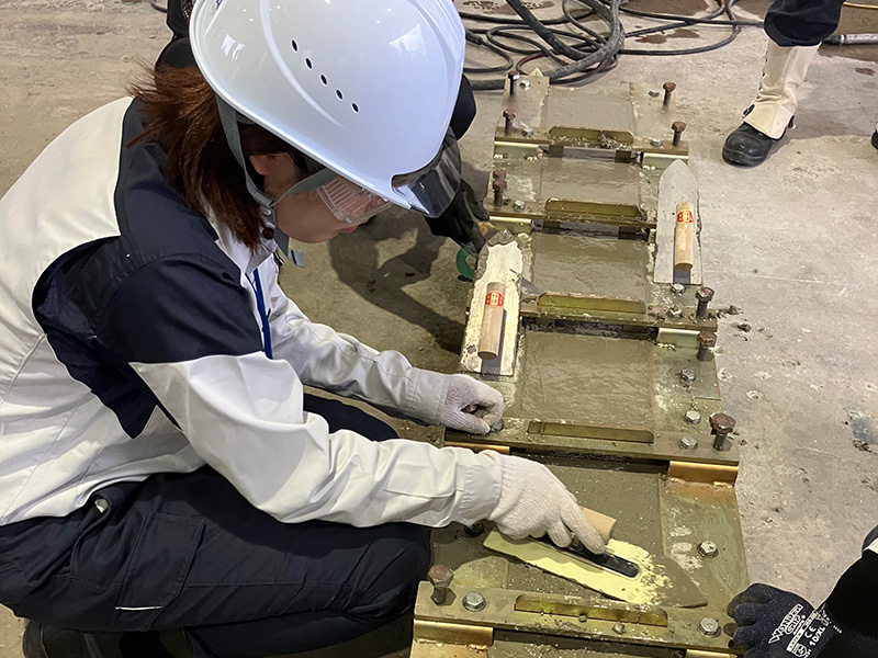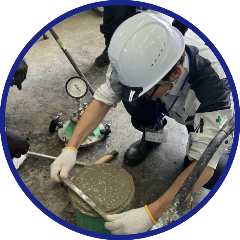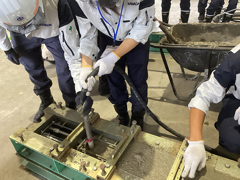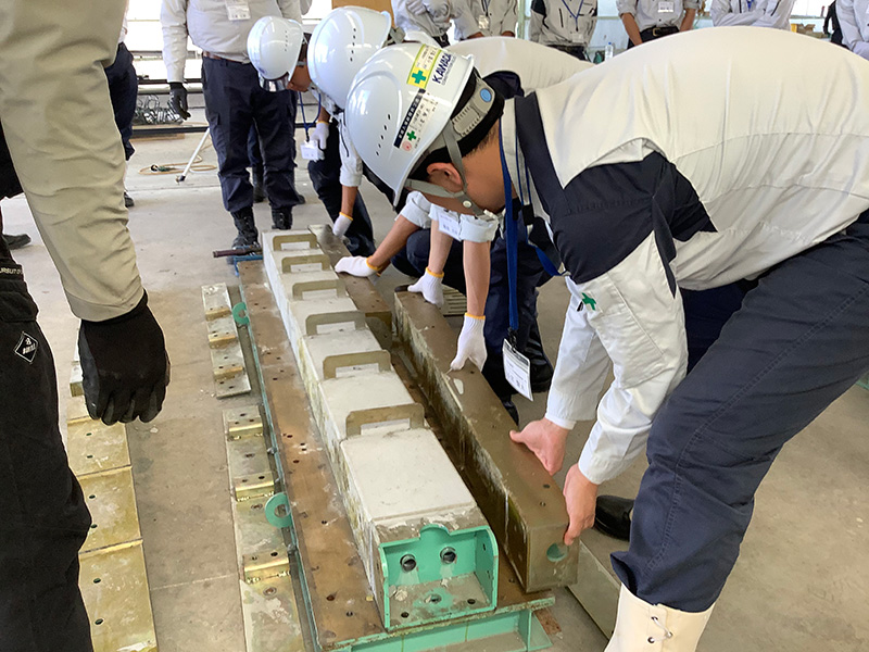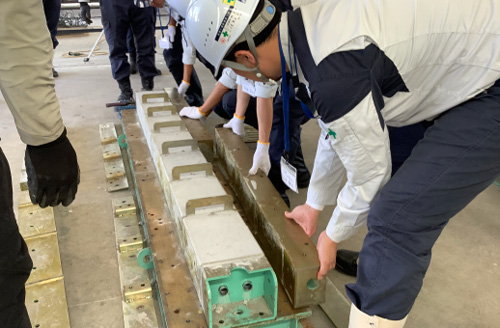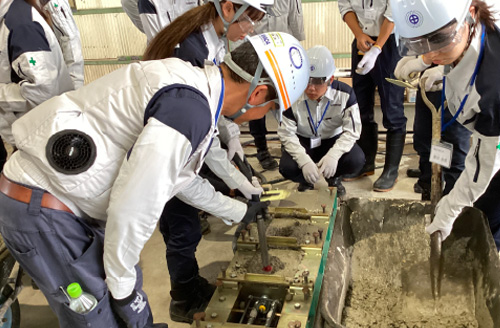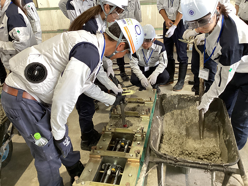 設計図面を基に、実際に手を動かして2日間かけてPC梁製作を製作します。先ずは、1日目はコンクリート打設に向けて、鉄筋組立やものづくりには欠かせない「コンクリートの仕事」を理解してもらうため、性状試験・供試体採取を行います。最後に、実際のコンクリート打設を体験できます。