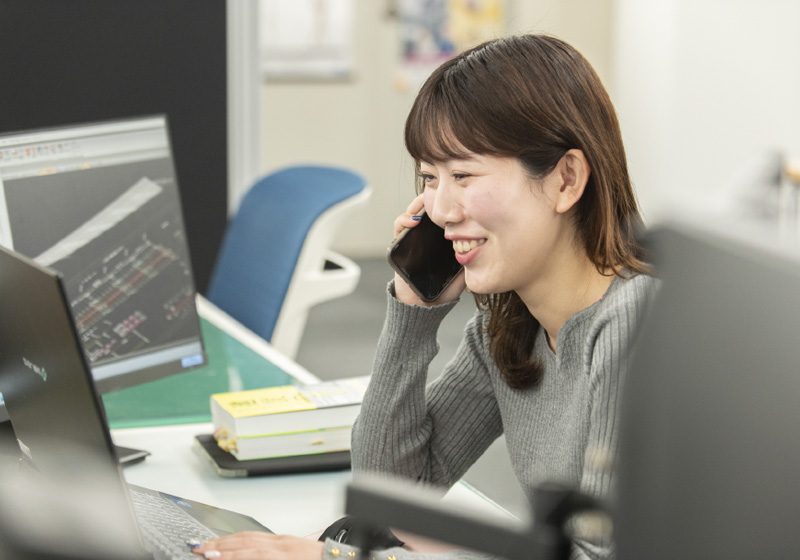 就活当初は、東京で働いてみたいという思いから、国家公務員を目指していました。その視野の中に国土交通省があったことから、建設業界の話題にも興味をもつように。旅行とドライブ好きの母と一緒に高速道路を走った思い出や、大学の通学路にあった橋が架け替えられたことで通学時間が大幅に短縮した経験なども合わさり、募集の掲示があった川田建設の説明会に足が向きました。とはいえ、私は文系なので建設業界に進んでも職種は限られると想定していましたが、その考えは一変。文系出身の先輩社員が手がけた橋梁のCAD図面などを見せてもらい、“未経験でも、こんなことができるの!”と衝撃を受けたことを鮮明に覚えています。同時に、未知の分野に進んで、新しい知識を身につけながら、自分自身を成長させたいとの想いがあふれ、入社を決めました。 志望の際、建設業のノウハウをゼロから学べる手厚い研修制度の存在も大きな後押しになりました。研修制度のKAWAKENアカデミーでは、建設分野の基礎用語から、設計時に必要な知識、またはCADの操作に至るまで座学や演習を通じて知識やスキルを習得。研修期間に、同期と苦楽を共にすることで同期とのつながりを築けたことも、仕事を続ける上での基盤になっています。