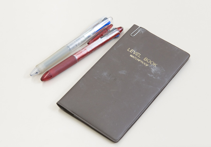 こだわりのアイテムは、耐水性フィールドノートと書いて消せるボールペンです。現場は天候に左右されやすいため、重要な指示や測定値を確実に記録するには、この耐水性フィールドノートが欠かせません。また、消すことができるボールペンは、図面への書き込みの間違いや急な仕様変更の修正も容易なため、正確な情報を記録・管理する上で非常に重宝しています。作業員の中には海外の方々もいるため、打ち合わせの時は言葉だけでなく、図を描いて説明することも多くあります。この2つのツールは正確に効率的に業務を進めるための、私の相棒といえます。